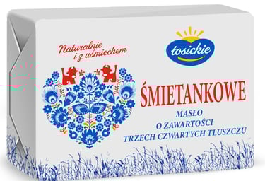 Łosickie cream butter with 3/4 fat 200g is produced by the traditional method of buttercreaming, which does not contain dyes and added salt. It is a butter with reduced milk fat content. This product is dedicated to all people who care about a healthy eating style and daily diet, who prefer products containing less fat, as well as fewer calories and cholesterol. Łosickie 3/4 fat cream butter is a valuable all-natural product, made from the highest quality cream. It is ideal for baking and frying and, above all, spreads easily on sandwiches.
